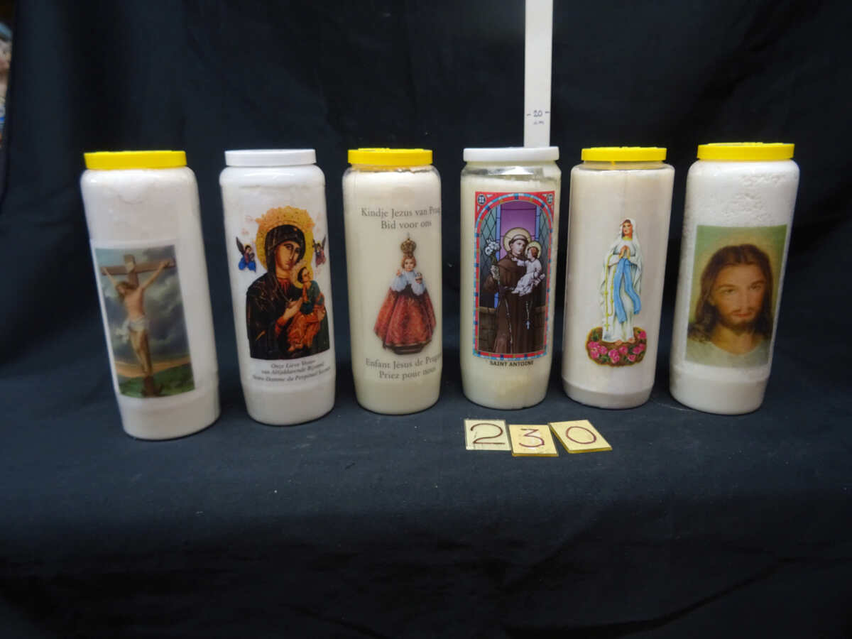 Kaarsen met diverse afbeeldingen van Heiligen.