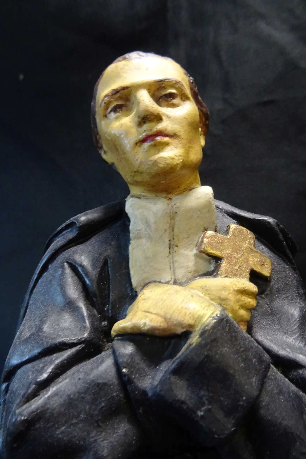 Hij houdt een kruis voor de borst.