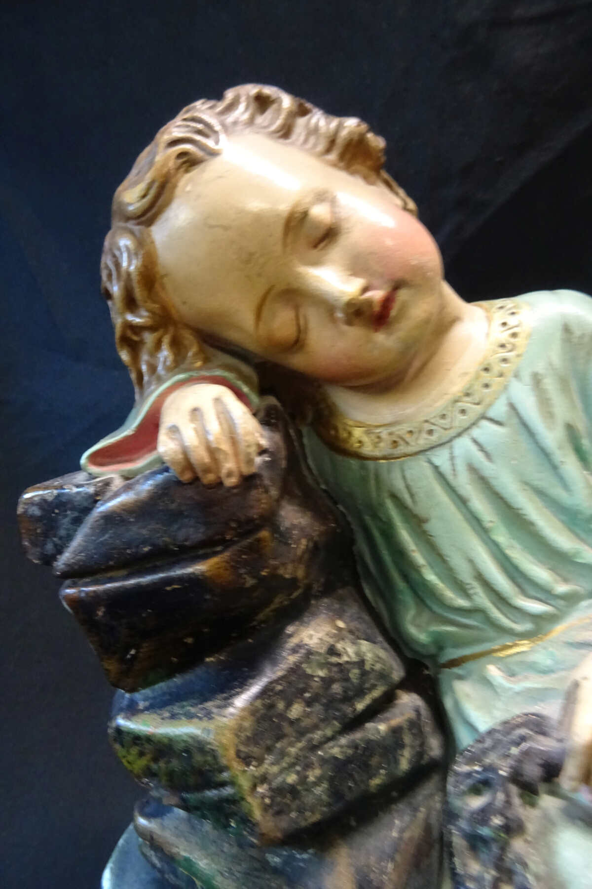 10013545=Kindje Jezus rustend tegen een stapel stenen.