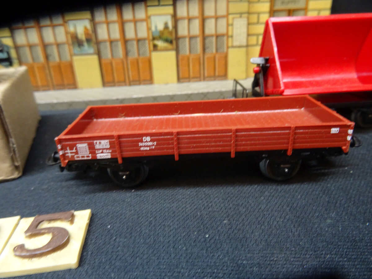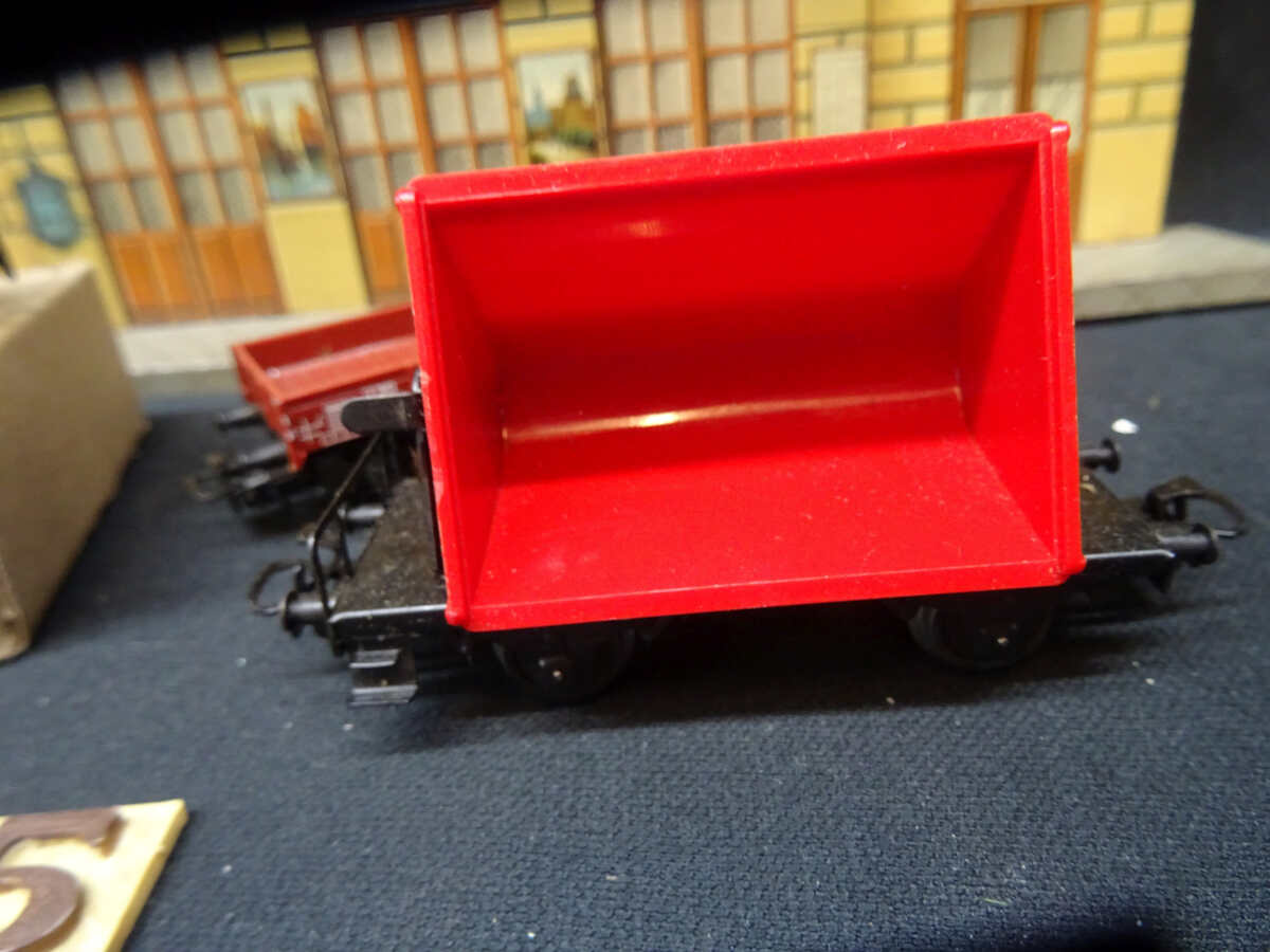 1 platte wagen en een rode kiep wagen.