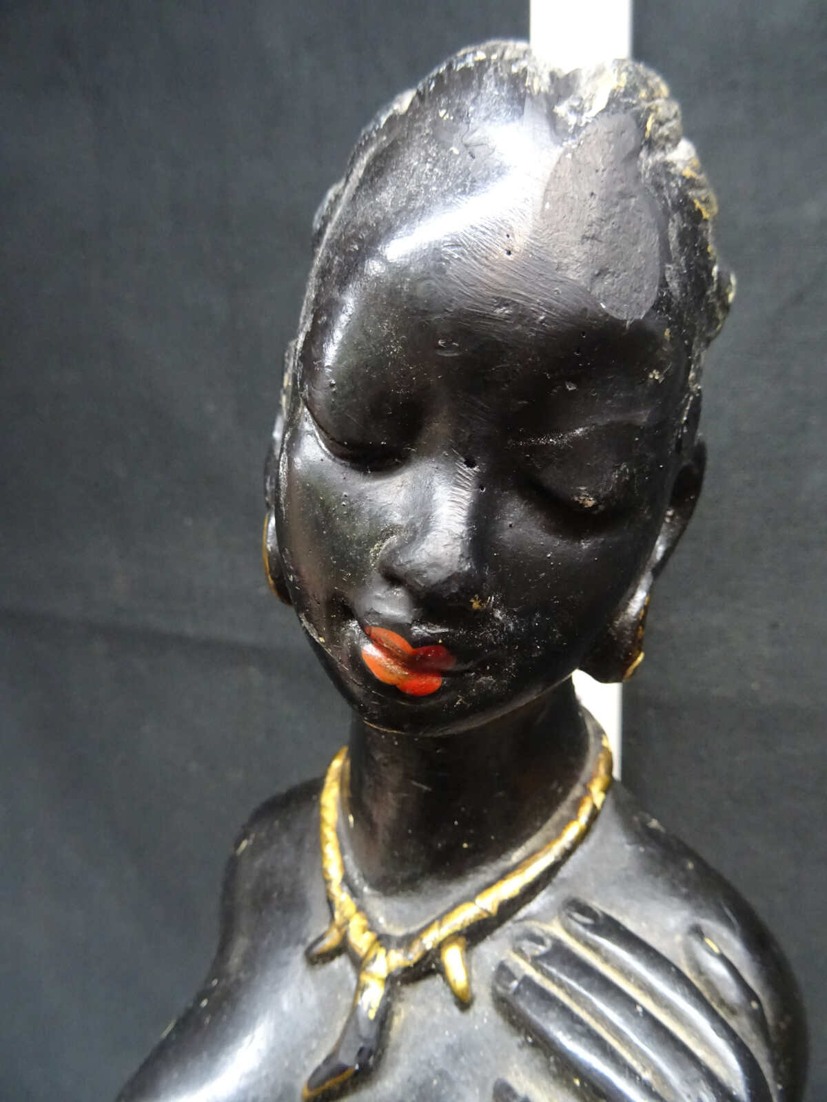 Gips, overwegend zwart met iets van rood en geel.