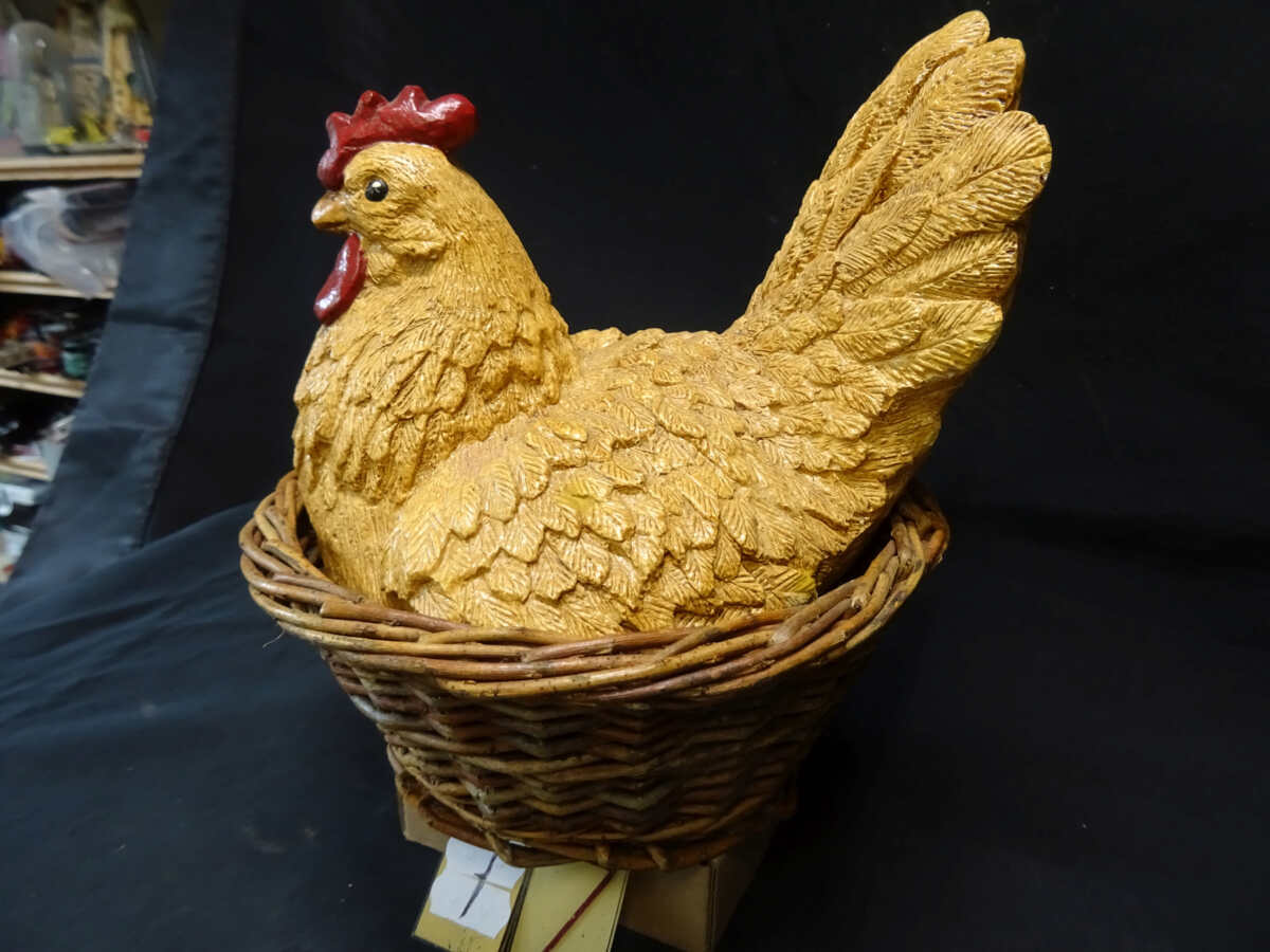 7077A5=Design beeld van een kip in een tenen (gips) mand.