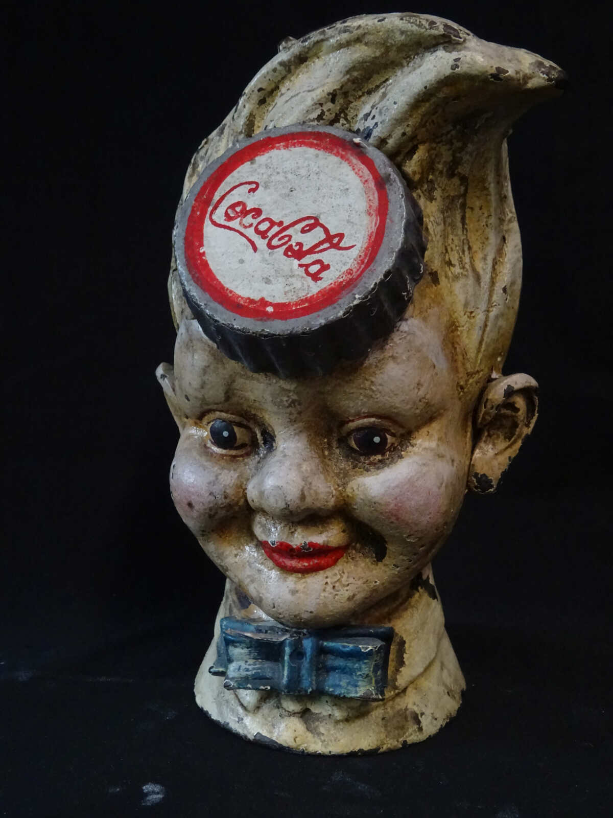 7091A5=Gietijzeren jongens hoofd met vlinder strikje van COCA COLA.